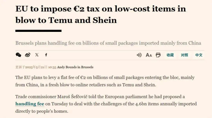 2025年5月20日,欧盟委员会提交议案,拟对进入欧洲市场的每个低于150欧元的小额包裹征收2欧元的费用。